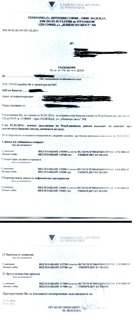 Служители на НАП са засекли нов опит за измама. От името на приходната агенция до някои фирми и граждани са изпратени уведомления за промяна в банковите сметки на администрацията, подпечатани с фалшив печат. В писмата (снимка на едно от тях – вижте по-долу) се описват „новите” банкови сметки на НАП, като клиентите се призовават да започнат да превеждат дължимите данъци и осигурителни вноски по тях.