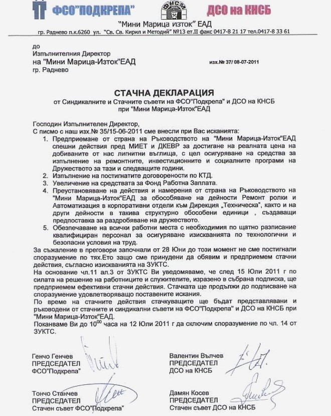 Декларация за започваща след 15 юли ефективна стачка изпратиха синдикалните организации на КТ „Подкрепа“ и КНСБ в „Мини Марица-изток“ ЕАД до изпълнителния директор на дружеството. В нея се поставят 5 искания, по които въпреки започналите на 28 юни преговори до момента не е постигнато споразумение. Стачката ще продължи до постигането му, посочват синдикатите. Последния срок за сключването на споразумение, който дават на ръководството на мините, е 10 часа на 12 юли.