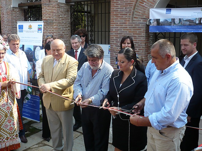 Премиерът Борисов, министърът на регионалното развитие и благоустройството Лиляна Павлова, министърът на културата Вежди Рашидов и кметът проф.Светлин Танчев прерязаха лентата под одобрителния поглед на американския посланик Джеймс Уорлик (с червената вратовръзка).