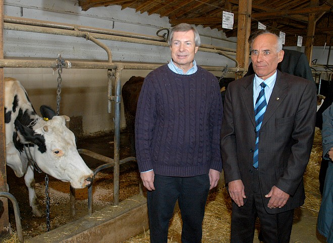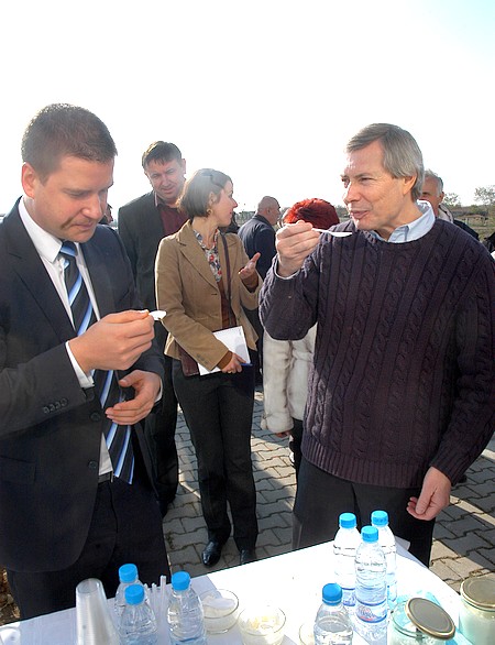Н.пр.Джеймс Уорлик (вдясно) и кметът на Стара Загора Живко Тодоров оцениха чистия вкус на киселото мляко, произведено в най-модерната кравеферма в общината.
