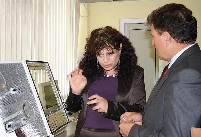 Доц.Стайка Лалева обяснява на областния управител Недялко Недялков предназначението на уредите в новата лаборатория.