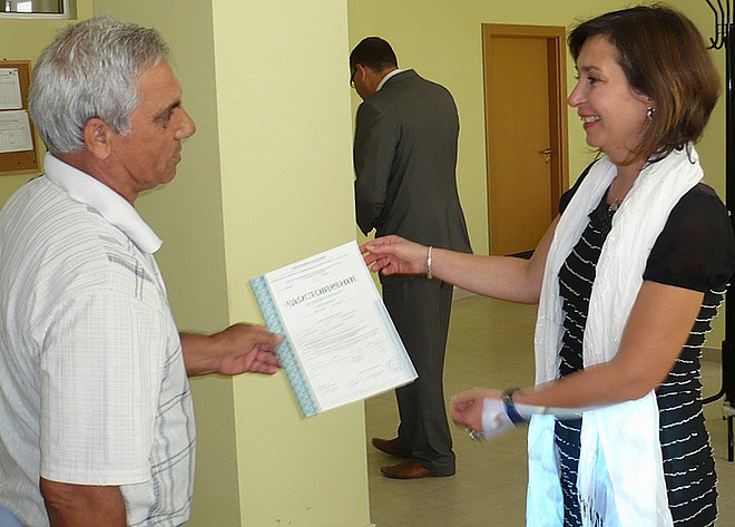 В присъствието на зам.-областния управител Димитър Драчев и директора на Бюрото по труда в Стара Загора Георги Гьоков зам.-министърът на труда и социалната политика Зорница Русинова връчи днес удостоверения за завършено професионално обучение на безработни, преминали това лято обучение по схема „Развитие” на Оперативна програма „Развитие на човешките ресурси“. Повечето от тях досега са работили като общи работници в строителството, хамали и докери.