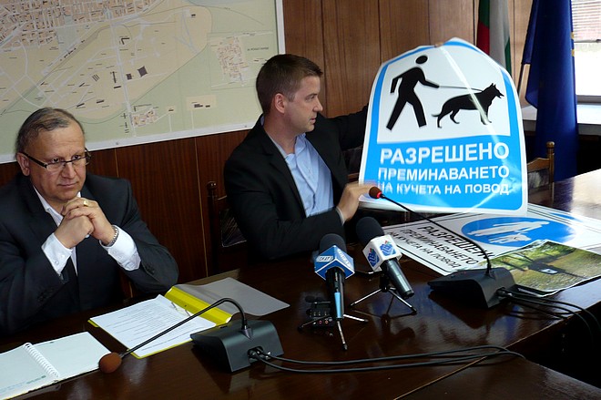 Забранителните знаци в парковете, които предизвикаха напрежение сред собствениците на кучета в града, ще бъдат заменени с такива, на които ще пише „Разрешено преминаването само на кучета на повод“. На всички детски градини, училища и площадки за деца ще останат забранителните знаци, увери кметът.