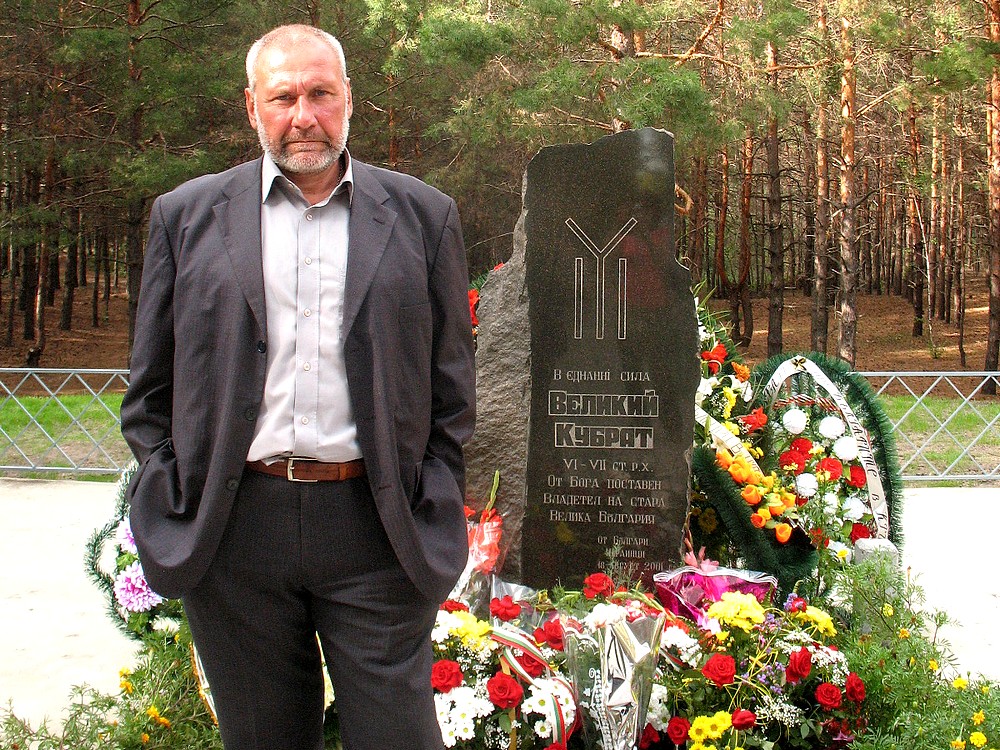 Проф. Овчаров пред сегашния паметник на хан Кубрат, изграден преди 10 години на мястото, където е открита гробницата му.