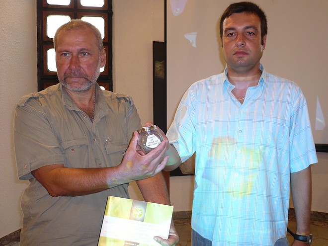 Проф.Николай Овчаров дари на музея в Казанлък стъкленица с пръст от гроба на хан Кубрат
