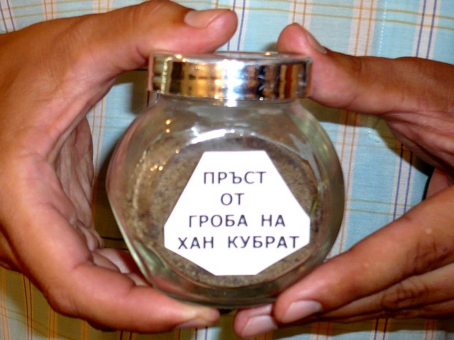 Големият наш археолог проф.Николай Овчаров (вляво на първата снимка) дари днес на Исторически музей „Искра“ в Казанлък стъкленица с пръст от гроба на хан Кубрат – създателят на Велика България. Дарението прие директорът на музея Момчил Маринов. В съствава на наша делегация проф. Овчаров бе в Малая Перешчепина, Полтавска област, Украйна, във връзка със 100-годишнината от откриването на гроба на владетеля през 1912 г. и провеждането по този повод на традиционния Кубратов събор. Веднага след завръщането на делегацията ни стана ясно, че български патриотични организации са подели инициативата на лобното място на хан Кубрат да бъде вдигнат голям мемориален комплекс. За него ще бъдат необходими около 500 хиляди евро. Организаторите са уверени, че средствата ще бъдат събрани бързо от родолюбиви българи чрез набирателните сметки на Международния благотворителен фонд „Хан Кубрат“, чийто пратеник на добра воля по света е проф.Овчаров (публикуваме ги по-долу). Подобни урни с пръст ще получат музеят в Кърджали и църквата на отец Боян Саръев в Родопите.
