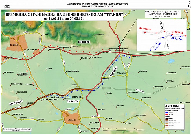 Схема на движението до неделя на обед, когато ще бъде отворено за движение и северното платно от участъка, в посока Бургас-София. Снимка АПИ.