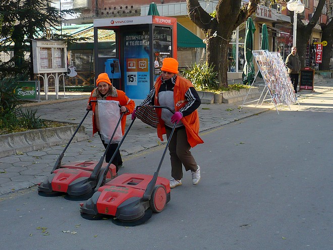 Студено е, но по-добре да събираме листа, отколкото да чистим сняг и лед - си говорят тези прилежни труженички, докато тикат механичните си "прахосмукачки" по "Цар Симеон Велики".