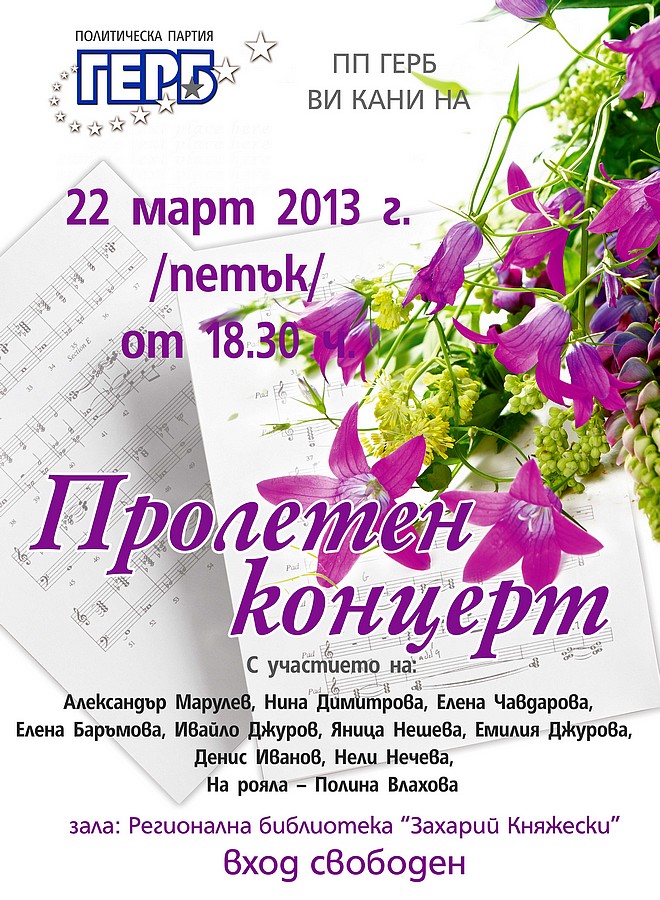 На 22 март от 18:30 ч. в Регионална библиотека „Захарий Княжески” по традиция, за четвърта поредна година, ПП ГЕРБ – Стара Загора организира Пролетен концерт. Уастие в него ще вземат Александър Марулев, Нина Димитрова, Елена Баръмова, Ивайло Джуров, Яница Нешева, Емилия Джурова и Денис Иванов. На рояла ще бъде Полина Влахова. Гости на събитието ще са изпълнителките Елена Чавдарова и Нели Нечева.