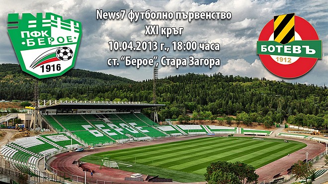 Утре, 10 април, от 18:00 часа “Берое” приема “Ботев” (Пловдив) в мач от XXI кръг на News7 футболно първенство. Главен арбитър на срещата ще бъде Вихрен Манев от София. Срещата за старозагорци пропускат възстановяващият се Емил Ангелов, както и Борислав Стойчев и Елиаш да Силва, които в срещата срещу “Левски” получиха своите пети жълти картони.
