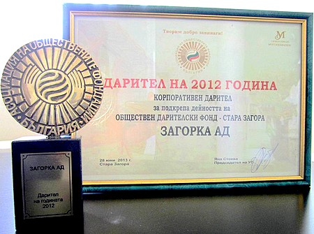 Компанията „Загорка“ АД за пореден път получи обществено признание за своите усилия в посока на корпоративната социална отговорност. Преди броени дни в Стара Загора се проведе церемонията „Дарител на годината“, организирана от Асоциацията на обществените фондации в България. По време на събитието водещата пивоварна получи наградата „Дарител на 2012 година“ в категорията „Корпоративен дарител“. Наградата отбелязва успешното сътрудничество на компанията с Обществен Дарителски Фонд – Стара Загора по повод реализацията на миналогодишното издание на дарителската инициатива на „Загорка“ АД.