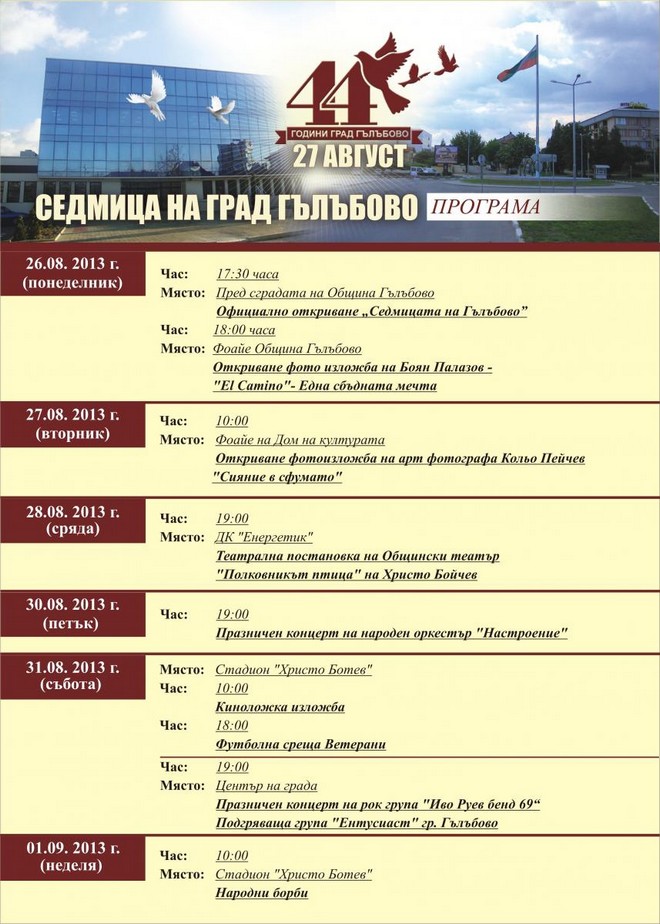 Предстоящо: Седмица на Гълъбово по случай 44 години от обявяването му за град