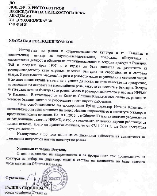 Кметът на община Казанлък Галина Стоянова изпрати писмо до председателя на Селскостопанска академия – София доц. д-р Христо Бозуков, в което тя изразява своята загриженост за бъдещето на Института по розата и етерично-маслените култури като единственият институт на Балканския полуостров, свързан с маслодайната роза и розопроизводството. С цел да се намали напрежението, възникнало след кадровите промени на директорския пост, довели до оставката на всички научни сътрудници в института, кметът Галина Стоянова изразява желание в състава на комисията по избор на нов директор да бъде включен представител на Община Казанлък.