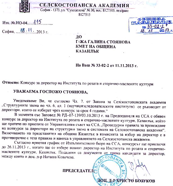 Със свое писмо председателят на Селскостопанска академия доц. д-р Христо Бозуков информира, че конкурсът ще приключи до 26 ноември 2013 г., когато ще бъде избран нов директор на ИРЕМК. Подадени са документи от трима кандидати, вкл. и от доц. д-р Наташа Ковачева. Представител на Община Казанлък обаче няма да бъде включен в комисията, става ясно от писмото на доц. Бозуков до кмета на община Казанлък.