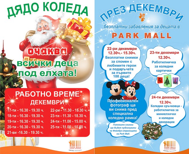 На 22-ри декември от 12.30ч. до 15.30ч. професионален фотограф ще снима децата и техните семейства пред специална коледна рамка, заедно с други любими герои на най-малките- Мики Маус и Мини Маус. Приятелите са подготвили и малки подаръчета за първите 100 деца. Снимките са безплатни и всички ще бъдат качени на Фейсбук страницата на Park Mall на следващия ден. Те са чудесен подарък за бабите и дядовците, които, както знаем, са най-големите почитатели на празничните снимки!