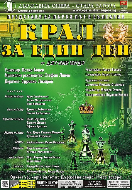 На 23 януари 2014 г. за първи път у нас Държавна опера – Стара Загора ще представи комичната опера на Джузепе Верди „Крал за един ден”, либрето – Феличе Романи. В премиерните дни – 23, 24 и 28 януари, в постановките на „Крал за един ден” ще се изявят три състава солисти на първата извънстолична опера.