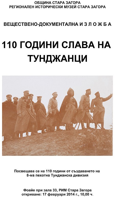 На 17 февруари 2014 г. (понеделник) от 10:00 ч. в зала № 33 на Регионалния исторически музей в Стара Загора ще бъде проведена теоретична конференция, посветена на 110 години от създаването на 8-ма пехотна Тунджанска дивизия. Организатори са Община Стара Загора, РИМ – Стара Загора, Областният съвет Съюза на офицерите и сержантите от запаса и резерва, както и военно формирование 24-150.