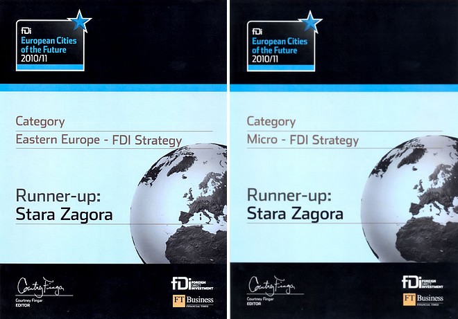 В изданието на конкурса „Градове и региони на бъдещето 2010/11” градът е в челната тройка на 2 категории: „Първите 5 FDi града за привличане на преки чужди инвестиции в Източна Европа” и „Първите 5 FDi микро-градове за привличане на преки чужди инвестиции в Европа”. Категорията микро-градове включва тези с население под 250 000 жители, поясни Румяна Грозева от Агенцията за регионално икономическо развитие в Стара Загора.