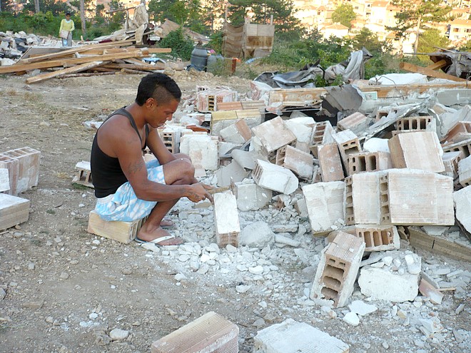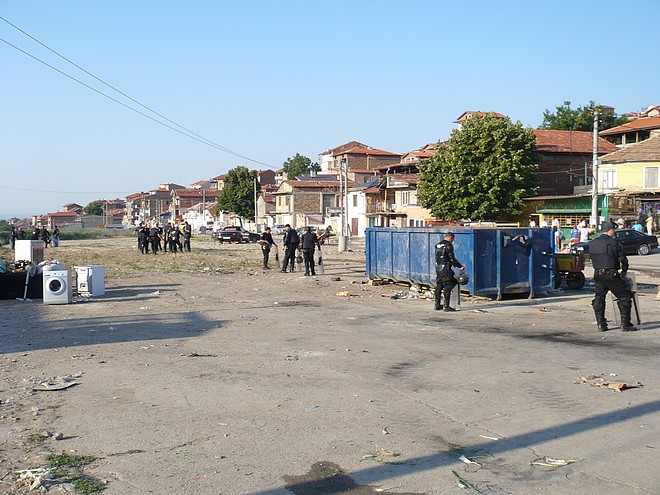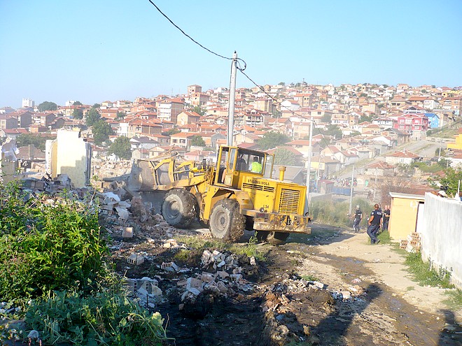Фадромата отново започна да събаря незаконни постройки в присъствието на жандармерия малко след 7.00 часа. За днес са останали 22 от 55-те планирани за премахване сгради в първия етап на операцията. Този път зоната за зачистване е по-ниско по склона на дерето. Теренът е стръмен, проходите между къщите са тесни и неудобни за работа. По тях се стичат вади мръсна вода, често по почти цялата им ширина, което крие опасност от зарази. Между къщите се мяркат пуснати свободно кучета. На стопаните на по-едрите жандармерист разпореди да ги изведат и вържат встрани от работната територия, за да няма ухапани.