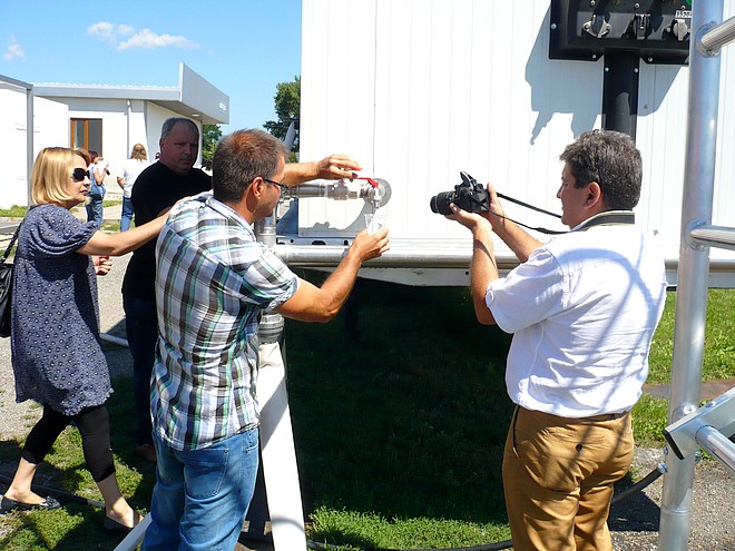 Посланикът на Казахстан Темиртай Избастин се качва да разгледа мобилния пречиствателен модул на "ЕлфиТех"