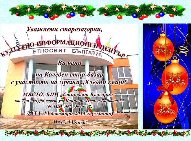 За първи път на 13 декември 2014 г. от 13 часа в Стара Загора ще се проведе първият Коледен етно-базар. Домакин на събитието е Културно-информационният център „Етносвят България“, в партньорство с Община Стара Загора. Жителите и гостите на града ще имат възможност да закупят уникални подаръци за най-светлия празник на близките си хора.