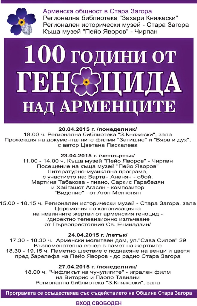 24 април 1915 г. бележи началото на геноцида над арменците в Османската империя. На този ден стотици арменски интелектуалци, учители, лекари и политически деятели са арестувани и скоро след това екзекутирани. Така започват нечуваните кланета на повече от милион и половина арменциq представляващи 75% от арменското население в границите на Османската империя и почти 40% от цялата арменска нация в света.