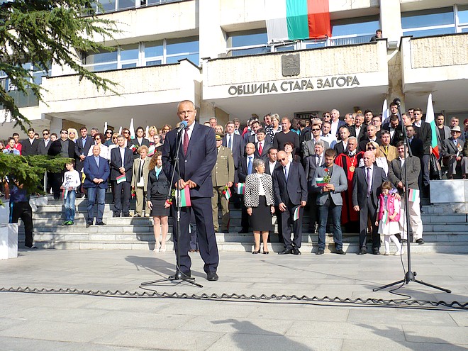 Празникът започна в 10.00 часа тази сутрин пред сградата на Общината с вдигане на знамената на България, Стара Загора и Европейския съюз. Поздравление към старозагорци отправи изпълняващият длъжността кмет Йордан Николов.