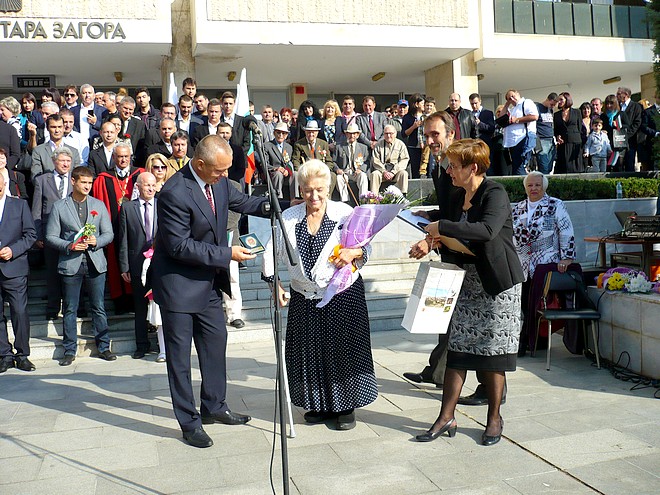 От неговите ръце символичния ключ на Стара Загора получи и вдигна високо над главата си новоизбраният на кмет на Млада Загора Доника Желязкова от ПМГ „Гео Милев“. След което Йордан Николов връчи почетни знаци за заслуги и принос към развитието на Общината на народната певица Пенка Павлова и на балерината Снежана Дескова. Новият Почетен гражданин на Стара Загора Петра Мечева също получи атрибутите на престижното звание – плакет и огърлица.