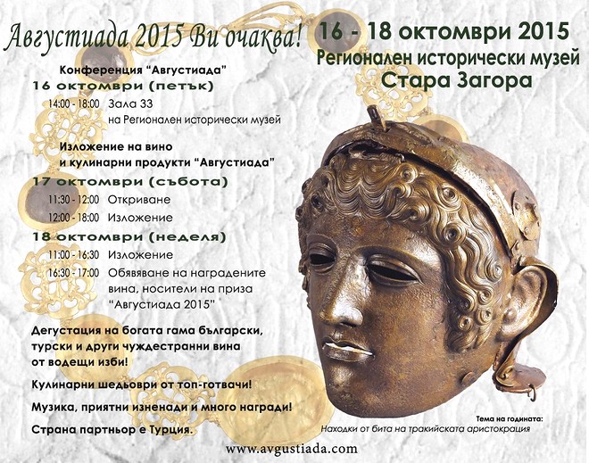 Официалното откриване на международния винен фестивал „Августиада-2015“ с последваща дегустация на богата гама български, турски, македонски и сръбски вина от 30 водещи изби е днес (събота, 17 октомври) с начален час 11.30. Мястото е в Регионалния исторически музей – Стара Загора. Четвъртият поред фестивал и тази година ще се проведе на Античната улица и лапидариума в музея.