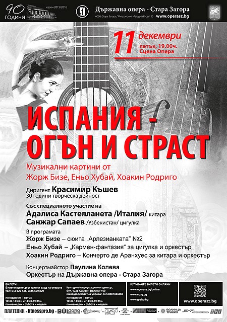 Този празничен концерт от поредицата коледно-новогодишни спектакли на Държавна опера Стара Загора ще предложи на почитателите на класическата музика искрящи творби, въплъщение на страстния испански темперамент.