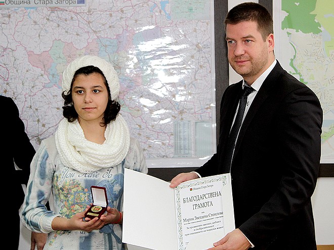 „Мария извърши истински подвиг и показа, че е голяма по душа и сърце. Тя заслужава нашите адмирации и е пример за всички нас – да бъдем хора, да даваме от себе си. Тя даде най-важното – спаси един човешки живот. Затова искам да благодаря на Мария от името на цялата старозагорска общественост и от името на Общината. Ние ще бъдем до нея и ще продължим да й помагаме, както и до всички деца, които имат нужда от подкрепа“ – каза кметът. В знак на благодарност той й връчи Знака на Стара Загора, благодарствена грамота и подарък – лаптоп. Живко Тодоров съобщи още, че е открита дарителска сметка на името на Мария, а общински съветници ще внесат предложение в ОбС да й бъде отпусната стипендия докато учи. Подарък получи и съученичката на Мария – Янка, която е била заедно с нея по време на смелата й постъпка в тролея.