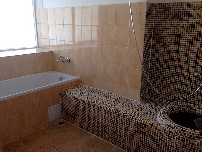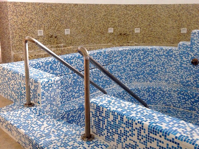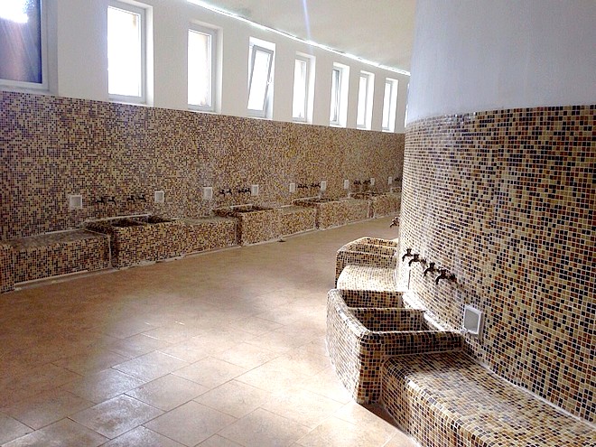 Входът за банята остава разделен на мъжки и женски помещения, с монтирани по 12 душа, а допълнителните услуги са обособени в отделно крило.