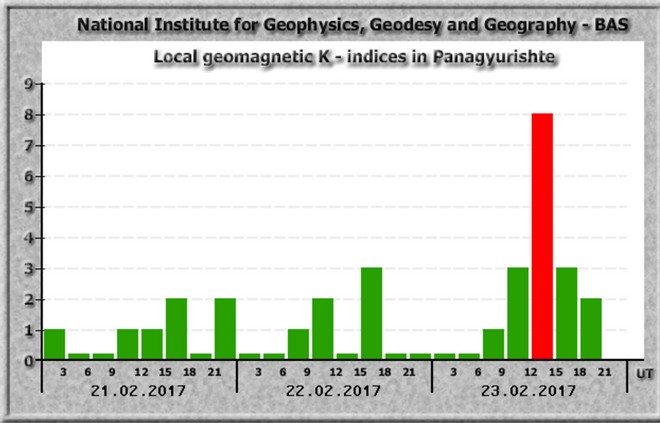 След като на 20 февруари над България се разрази 6-часова геомагнитна буря с внезапно начало (за нея съобщихме тук), вчера следобед данните от геомагнитната обсерватория в Панагюрище поднесоха нова, още по-голяма изненада. Между 14 ч и 17 ч местният K- индекс за геомагнитната обсерватория в Панагюрище удари нов рекорд поне за последните 5 години, достигайки бал 8, т.е. много мощна буря.