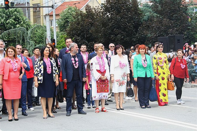 Най-голям интерес предизвика празничното шествие по централния булевард. Поведоха го тазгодишната Царица Роза Цвети Илиева и нейните подгласнички, качени на колесница. Деца от детски градини и училища, служители от културни институции, групи за народни песни и танци, кукерски състави, читалищни дейци, гости от Гърция, Македония, Сърбия и други страни се включиха в пъстрото дефиле, което продължи повече от час. Накрая пред трибуните се изви българско хоро, а Царица Роза закри тазгодишния Фестивал на розата и пожела на гостите и на своите съграждани догодина отново да бъдат част от незабравимия празник в Града на розите и тракийските царе.