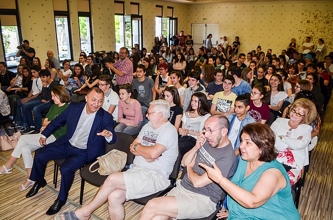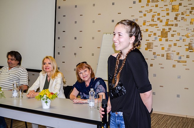Нора получи аплодисментите на препълнената с ученици от езиковата гимназия зала, както и на авторитетното жури, председателствано от режисьора Станимир Трифонов. Второ място беше присъдено на десетокласничката Богомила Китанова (на третата снимка) със заглавие „Никой“, а трето място спечели Петър Дойчев от 12-ти клас със сценарий, наречен „Yourself“.