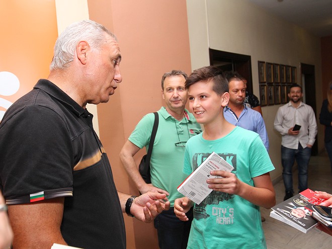 Повече от час Стоичков раздава автографи и разговаря с представители на медиите и старозагорските фенове. На пресконференцията снощи присъства пъpвият му кoмандиp от казармата в Стара Загора о.р. майор Атанас Ангелов, когото Стоичков прегърна и разцелува сърдечно, наричайки го „бате Наско“ (на neтата снимка).