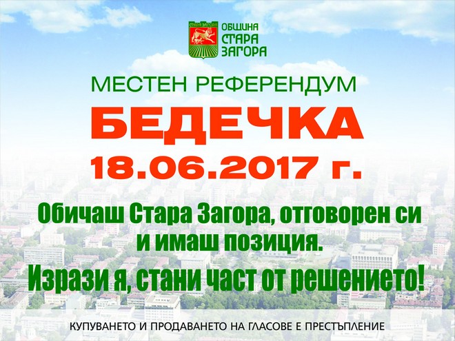 Общо 204 са избирателните секции, в които ще се гласува на предстоящия на 18 юни 2017 год. местен референдум в община Стара Загора. Броят на избирателите по основни списъци е 143 172 (в т.ч. 34 души от специалната секция в диспансера).