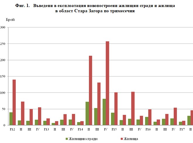 По предварителни данни на Националния статистически институт броят на въведените в експлоатация жилищни сгради в област Стара Загора през второто тримесечие на 2017 г. е 29, а новопостроените жилища в тях са 46, съобщиха от отдел „Статистически изследвания – Стара Загора“ към Териториално статистическо бюро „Югоизток“. Спрямо второто тримесечие на 2016 г. сградите са с 18 повече, а жилищата в тях се увеличават с 28, или със 155.6% (фиг. 1).