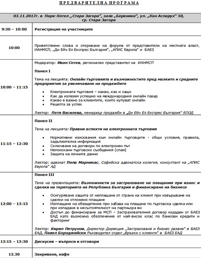 По време на семинара ще бъдат дискутирани теми, засягащи силата на електронната търговия като още едно средство за повишаване възможностите на малките и средните предприятия за реализация на стоки и услуги както на вътрешния, така и на международните пазари. Лекторите Петя Василева – мениджър продажби в „Ди Ейч Ел Експрес България“ ЕООД и адвокат Пепа Марникас, Софийска адвокатска колегия – консултант на „АПИС Европа“ АД, ще запознаят присъстващите с особеностите, детайлите и правните аспекти на онлайн търговията. Участниците ще имат възможност да задават своите въпроси както по отношение на продажбите през интернет и етапите от износа на една пратка, така и за нормативните изисквания. Кирил Петрунов, Директор на дирекция „Застраховане и бизнес развие“ в БАЕЗ ЕАД и Павел Бороджийски – ръководител на отдел „Връзки с клиенти“ в БАЕЗ ЕАД ще представят възможностите за застраховане на плащанията при износ и сделки на територията на Република България, както и за финансиране на бизнеса.