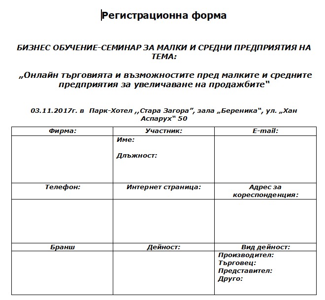 На 3 ноември 2017 г. (петък) в Стара Загора ще се проведе бизнес обучение-семинар на тема „Онлайн търговията и възможностите пред малките и средните предприятия за увеличаване на продажбите“.